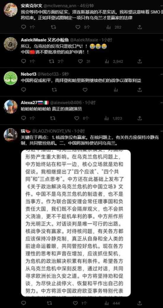 不少乌克兰人表示,这场谈话是战争开始以来的第一次,他们非常期待,并希望了解更多细节。甚至已经有网友“自己动手,丰衣足食”了,开始逐条分析起咱的通稿来,有戎哥啃文件那味了。