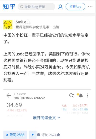 但是,知乎上有个恨国党却真去抄底美国银行了:他认为我们这些“小粉红”的认知水平比较低,他认知高,于是就在30多美元的时候抄底了美国第一共和银行(First Republic Bank/CA,简称FRC)。