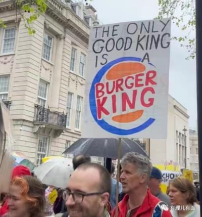 人群高呼“不是我的国王”等口号,还有抗议者手举“唯一好国王是汉堡王”的标语,构成了现场一道“别样风景”。