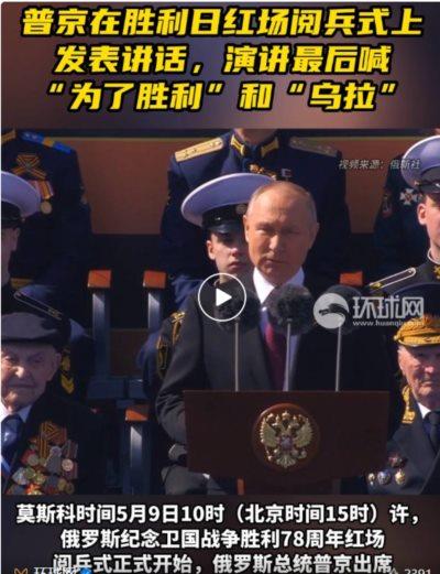 根据俄媒发布的现场直播视频,普京在讲话最后喊“为了胜利”和“乌拉”,现场受阅俄士兵也跟着连喊3遍“乌拉”。