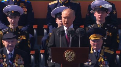 普京5月9日在红场阅兵式上讲话的画面,图源:俄媒直播画面
