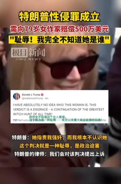 法院判决特朗普要向卡罗尔赔偿500万美元,其中27年前的暴力性侵,赔偿200万,如今的“诽谤罪”,赔偿300万。