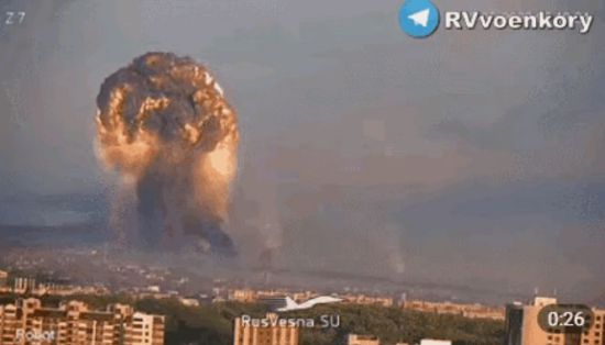 5月13日,俄军对乌克兰西部城市赫梅利尼茨基发动空袭,该目标疑似为一个弹药库。空袭引发剧烈爆炸,升腾起核爆一样的蘑菇云。有人据此推测,该目标储存着英国提供给乌克兰的贫铀弹。