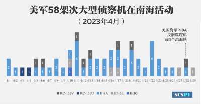 ▲ 2023年4月,美军累计出动58架次大型侦察机前往南海进行抵近侦察。来源:南海战略态势感知计划 (注:侦察架次根据ADS-B信号统计,由于部分美军机在执行侦察任务时采用虚假识别码或不开启信号,因此实际数目更多。)