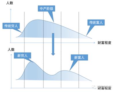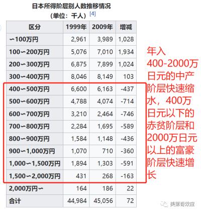 日本的中产阶层随着终身序列制的崩溃和日本企业竞争力的衰退,已经快速减少,而赤贫阶层和富豪阶层快速增长。日本已经从“一亿总中流”,变成了M型社会。