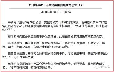 小布什当年有多狂妄?911之后,小布什就发布演讲,号令天下,各国必须并明确支持美国,否则就是支持恐怖主义。当然,恐怖主义的定义也是由美国说了算。