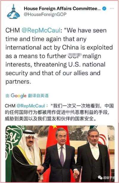 美国众议院外交委员会竟然发表声明,说中国促成沙伊和解,威胁了美国国家安全。这个声明,彻底暴露了美国的国家战略——唯恐天下不乱。中东乱了,最符合美国利益。