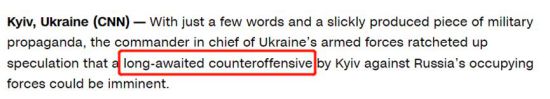 在对乌克兰总司令宣传视频的报道中,CNN使用的措辞是“等待已久”(long-awaited)的“大反攻”。
