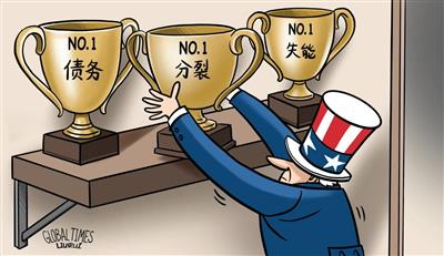 ▲ 美国背负着“债务爆表”、国家分裂、政治失能等多项“世界第一”记录。(漫画丨刘蕊)