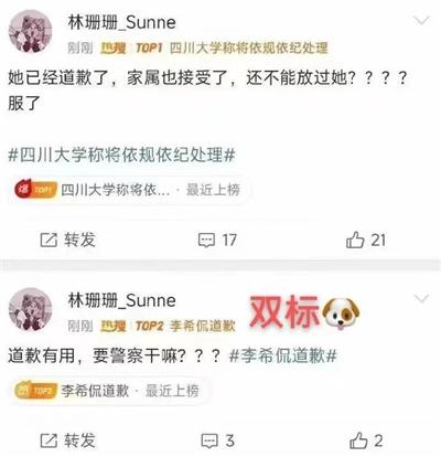 再比如,XXN才说过“道歉有用要警察干什么”,可一旦事情涉及自身了,就立即180度大转变,改说“她已经道歉了,还不能放过她?”