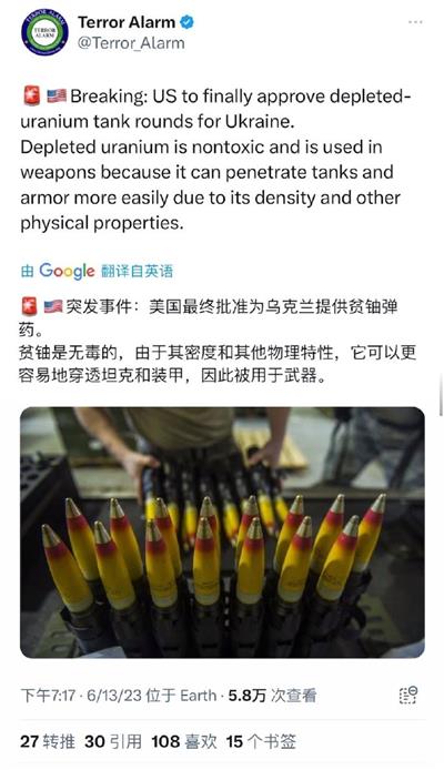 结果俄罗斯一直没部署与没用,普京后来还在回应时又专门指贫铀弹是“被归类为对人类……和环境最有害且最危险的武器”,可是盎撒国家呢,英国和美国先后将贫铀弹运往乌克兰了。