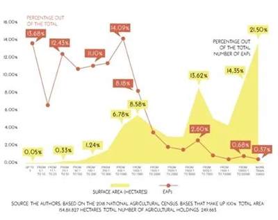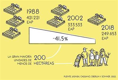 据阿根廷全国农业普查,由于土地日益集中在少数精英手中,全国农业用地持有数量在1988年至2018年间约下降了41%
