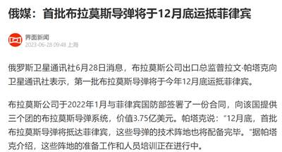 俄罗斯卫星通讯社6月28日消息,布拉莫斯公司出口总监向俄罗斯卫星通讯社表示,第一批布拉莫斯导弹将于今年12月底运抵菲律宾。