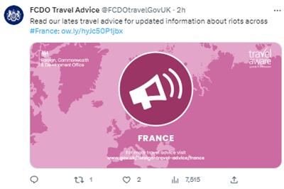 至于英国政府,倒是在其官网更新了赴法国旅行建议,提醒公民避开法国骚乱地区,“自6月27日以来,法国多地发生骚乱。许多(地区)出现暴力(行为)。商店、公共建筑和停放的汽车成为(袭击)目标。道路交通可能会中断,当地(公共)交通服务可能会减少。一些地方政府可能实施宵禁。骚乱发生地和时间无法预测。你们应留意媒体(信息),避开骚乱发生地,旅行时请向运营商查询最新建议,并遵从当地政府的建议。”