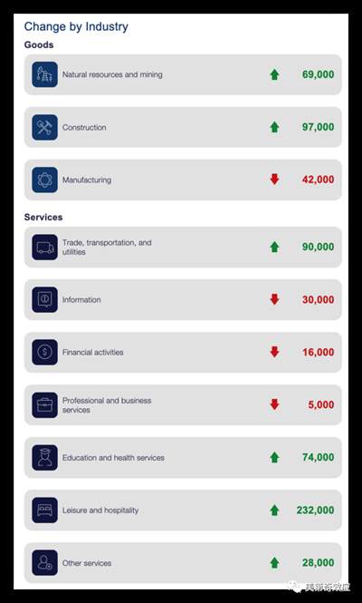再看看ADP发布的这份单月就业新增50万人的报告,你会发现,美国新增的就业当中,约有一半(23.2万人),来自于休闲和酒店业。这美国也没经历解封后的报复消费,咋服务员需求暴涨这么多呢?