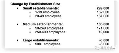 从雇佣员工企业分布看就更奇怪了。最没有竞争力的员工少于50人的小企业,新增近30万个岗位,竞争力中等的50-500人的中型公司,新增18.3万个工作岗位,而拥有超过500名员工的大型企业岗位数量减少了8000个。