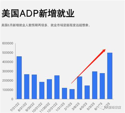 7月6日,美国ADP就业报告显示,6月美国私营部门就业人数经季节性调整后增加了49.7万人,为市场预期22.5万人的两倍多,远远超过前值27.8万,创下2022年7月以来最大月度增幅。