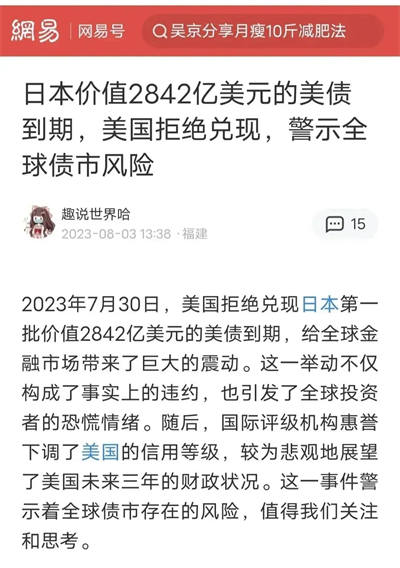 首先是,到2023年7月30日,美国拒绝兑现日本第一批价值2842亿美元的美债到期,给全球金融市场带来了巨大的震动与质疑。