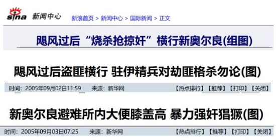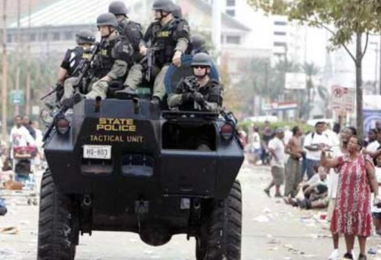拖了几天之后,布什政府终于派军队来了,但不是救灾,而是镇压,他们开着装甲车和武装直升机,在街头巡逻,遇到暴徒抢劫,“格杀勿论”。他们受命可以在必要情况下开枪击毙猖狂抢劫、强奸的“恶棍”。