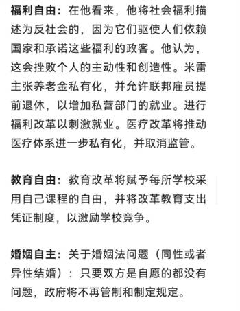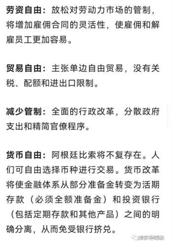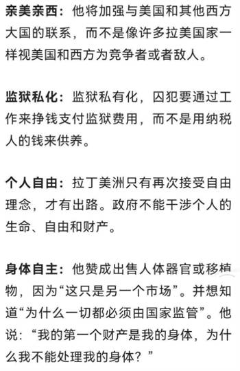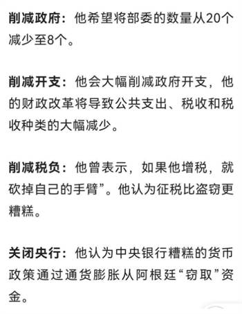 当地时间本周三,米莱首度接受外国媒体采访,相对完整地阐述了自己的施政纲领,提出了一系列激进的经济自由化主张,声称“当选后马上取缔央行,全盘推进美元化”。有网友整理出了米莱的施政清单: