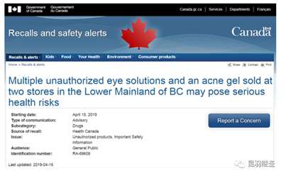 加拿大卫生部指出,日本参天制药的四款眼药水含有处方药氨基己酸和新斯的明甲基硫酸盐。