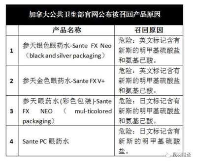2019年4月15日,加拿大卫生部官网宣布召回6款在售的日本产品(四种眼药水,一种痤疮凝胶,以及一种洗眼液),包括参天银色眼药水-Sante FX Neo(黑色和银色包装)、参天金色眼药水-Sante FX V+、参天眼药水(彩色包装)-Sante FX NEO以及Sante PC等等,其中4款眼药水因含有处方药氨基己酸和新斯的明甲基硫酸盐成分,可能引起严重的健康风险。