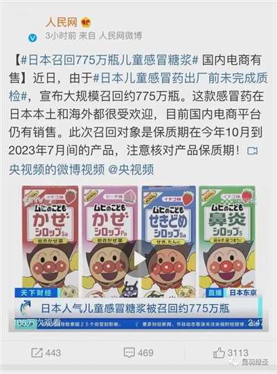 2020年10月,日本一款在本土和海外广受欢迎的“儿童感冒糖浆”系列产品,宣布大规模召回,数量约为775万瓶。据悉,这款“儿童感冒糖浆”,共有草莓、蜜桃等四种口味,主要针对3个月至7岁的儿童。与此同时,被召回的还有“太田胃散”、“便秘治疗药”。