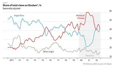 《经济学人》统计了豆瓣上列出的26000部带有评分和大量观看次数的电影条目之后发现,从2010年到2022年,英文电影(好莱坞电影为主)观看次数的份额从53%下降到28%,而中国大陆制作的电影份额从21%上升到55%。