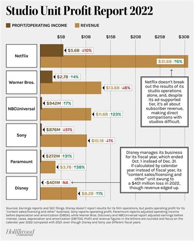 不论是网飞、迪士尼+,还是派拉蒙,这些流媒体平台的确有不少热门作品给平台带来巨额利润,但是,为了维持客流量,平台也不得不采买大量“不赚钱”的作品。从账面来看,流媒体平台并无演员、编剧罢工口号中的暴利。