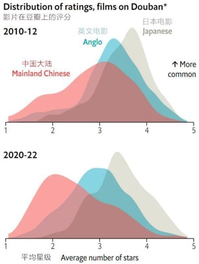 并且,《经济学人》还排除了一个干扰因素:从豆瓣数据来看,华语电影的评价,并没有比10年更高,反而是更低了。