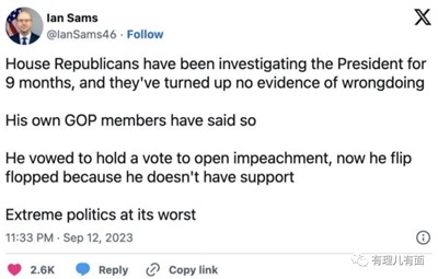 麦卡锡当然不会天真的认为,仅凭一纸提案就能将拜登拉下总统宝座。但只要在2024美国大选前,能将这些弹劾的内容见诸报端和社交媒体,曝露于公众舆论面前,他和共和党人的目的就已经达到了。