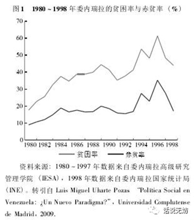 实行新自由主义改革的两届政府,将经济发展摆在首要位置,过于相信“市场对财富的分配作用”,试图通过长期的经济增长解决分配不平等问题,结果适得其反。在经历了10年的新自由主义改革之后,委内瑞拉的社会问题变得更为严重。有数据显示,1989-1998年10年间,委内瑞拉社会贫困现象进一步加剧,年均社会贫困率达到45.5%有些年份甚至超过50%;而在此之前的1980-1988年间,年均社会贫困率仅为32%(见图1)。自20世纪90年代,委内瑞拉的基尼系数持续爬升,甚至一度达到0.62的历史峰值,贫富差距的悬殊程度可见一斑。