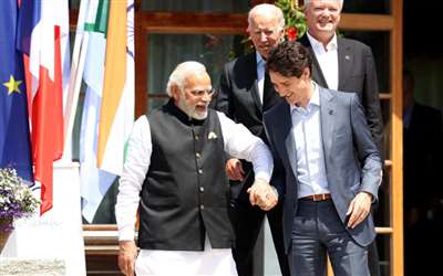 要知道现在印度和西方国家打得火热。2022年的G7峰会上,莫迪和特鲁多还出现手挽手、肩并肩、笑颜如花、让身后的拜登看了都有几分尴尬的场景。