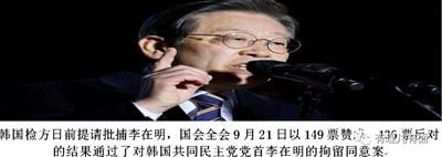 9月21日,韩国国会全体会议以149票赞成、136票反对、6票弃权、4票无效表决通过李在明拘捕提案。