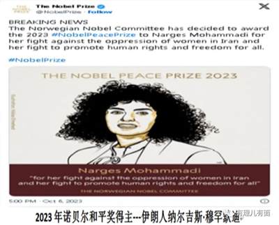 昨晚,诺贝尔委员会在挪威首都奥斯陆公布了2023年诺贝尔和平奖,获奖者是伊朗人纳尔吉斯·穆罕默迪。