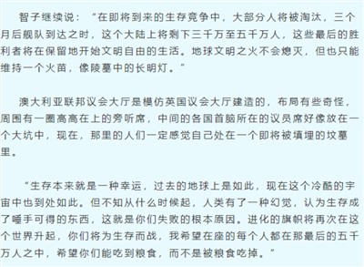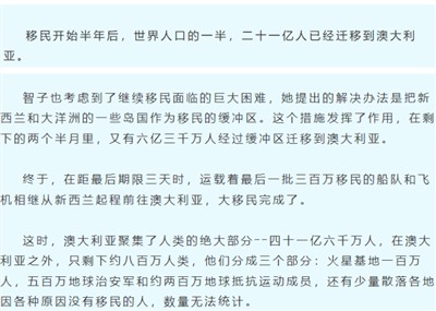 三体人宣布,全人类除300万人留在火星外,其他所有41亿人都必须迁移到澳大利亚,必须在一年内完成移民。