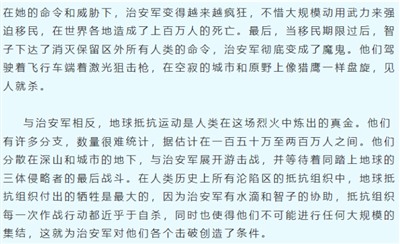 全人类约有200万人坚决抵抗三体人,但武器极度落后,每一次作战行动都近乎于自杀,也只能藏在深山和城市的地下,导致他们在移民期限过后被各个击破。