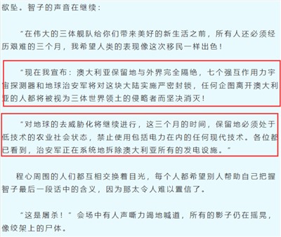 同时,留在澳大利亚的人类被禁止使用包括电力在内的现代技术,只允许处于低技术的农业状态,所有发电设施都会被三体治安军拆除。