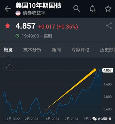 10年期美债的收益率,已经从今年3月只有3.4%,快速飙涨到现在4.85%。