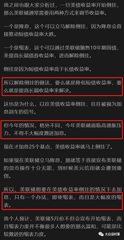 这句话的意思就是,这次美债倒挂会以长期美债收益率飙升的方式来解除,也就是美联储会大力度缩表。