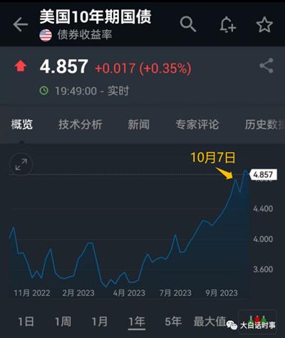 从图中可以看到,10月7日巴以冲突爆发后,只是让美债收益率短时间回落,但美债流动性危机,让美债收益率又很快大幅上涨,一度在昨天刺破5%收益率大关,今天才又回落至4.85%。