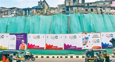 拆不了的贫民窟,印度政府用巨大的绿网和巨大的莫迪画像遮盖起来。