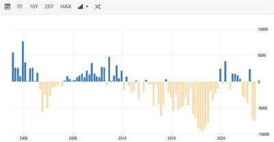 大家可以看到:绝大部分年份中,阿根廷的外贸其实是顺差,只有少数年份,才是逆差,也就是阿根廷在不管是货物,还是资源方面,它都是能赚钱的!