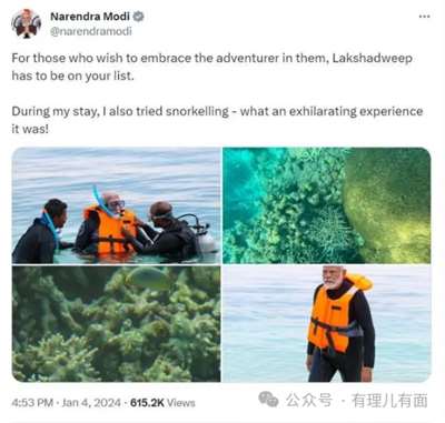 据《今日印度》报道,当地时间4日,莫迪去了拉克沙群岛,并在社交平台上分享他在浮潜的照片,同时发文称,“这是多么令人兴奋的经历!”
