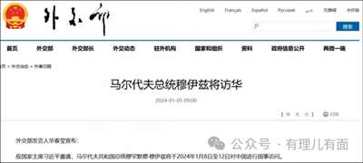 据我国外交部1月5日官网消息,马尔代夫总统穆伊兹将于1月8日至12日对中国进行国事访问,成为今年首位应邀访华的外国元首。