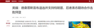 当地时间1月21日,美国佛罗里达州州长德桑蒂斯宣布退出了2024总统大选共和党初选,并宣布支持懂王,这是一个出人意料的变化,意味着美国政坛发生了巨变。