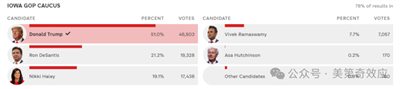 共和党初选第一场,1月15日的爱荷华州初选,特朗普用了短短30分钟就取得了胜利。最终计票,特朗普以51%的优势,取得碾压性胜利。