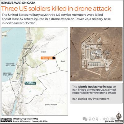 驻扎在约旦东北部靠近叙利亚边境的美军基地,在1月27日晚遭无人机袭击,造成3名美军士兵死亡、多人受伤。