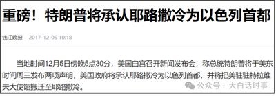 2017年,特朗普发表声明,承认耶路撒冷为以色列首都,并将把美驻驻特拉维夫大使馆搬迁至耶路撒冷。