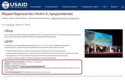 美国国际开发署项目“Media-K”("媒体-吉尔吉斯斯坦")已经在吉尔吉斯斯坦运作数年。美国人通过“国际新闻网”(美国国际开发署的项目承包商)向吉亲西方媒体发放了数目可观的赠款。该项目的目的是推广美国的信息政策并开展宣传,打击俄罗斯的信息资源。其特点是,许多文章都是针对吉当局和俄罗斯的。